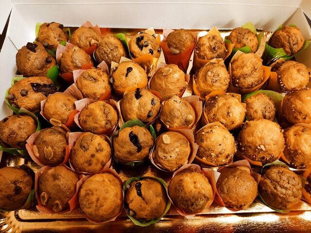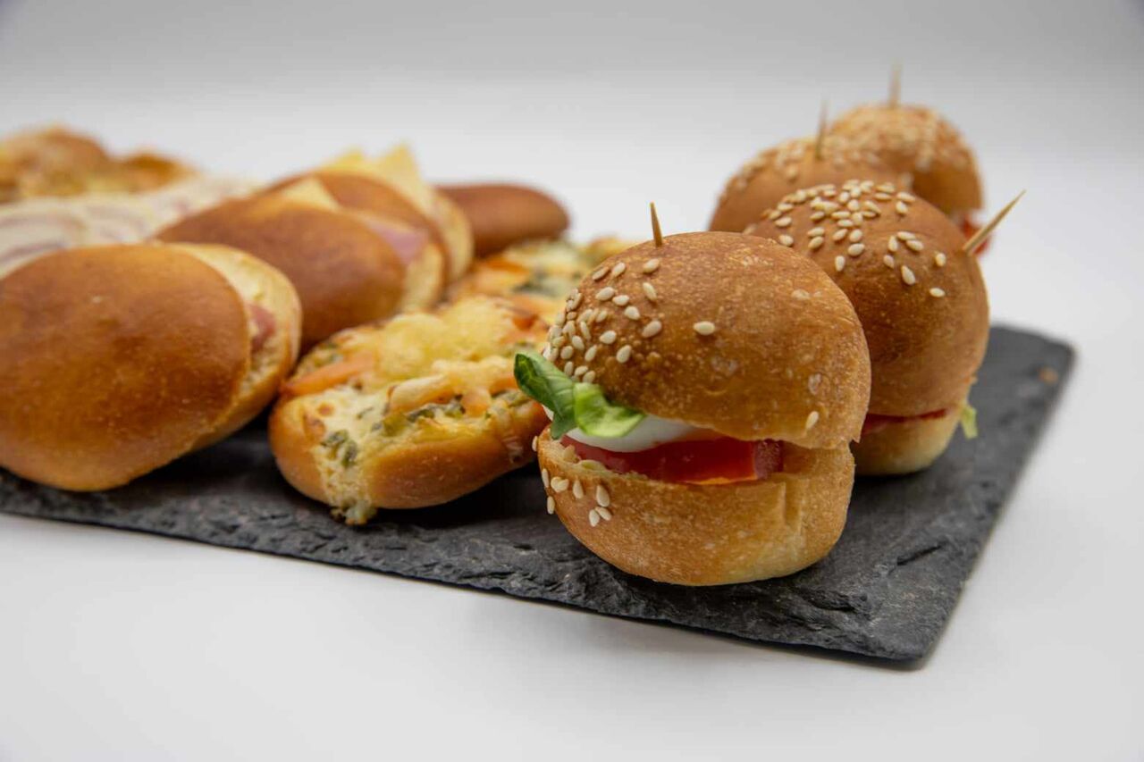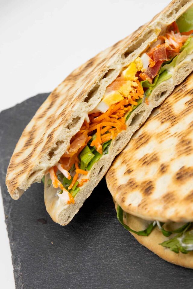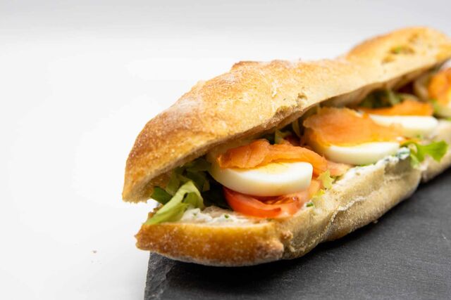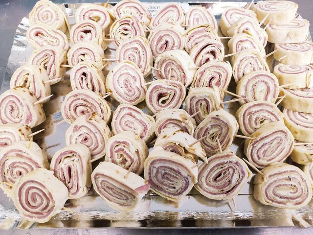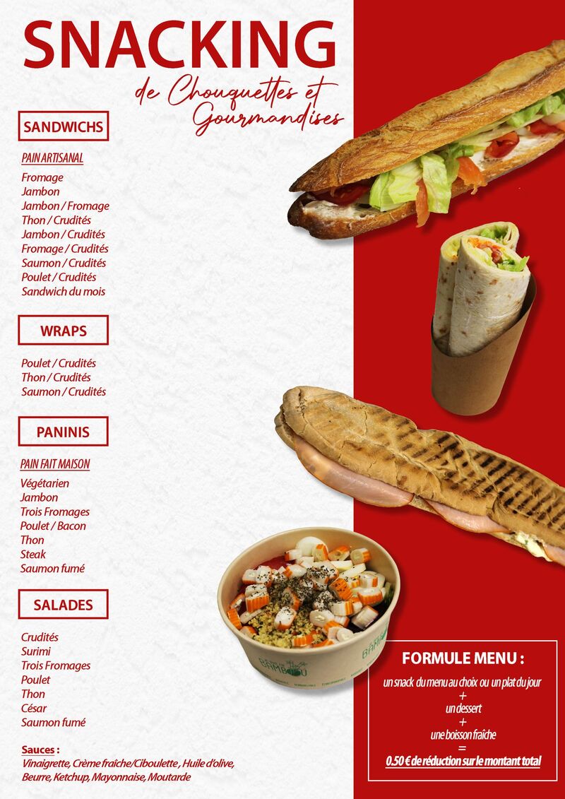 Côté salé : sandwichs, salades, wraps, paninis (pain fait maison), plats chauds, quiches, croques monsieur, petits fours salés, ...