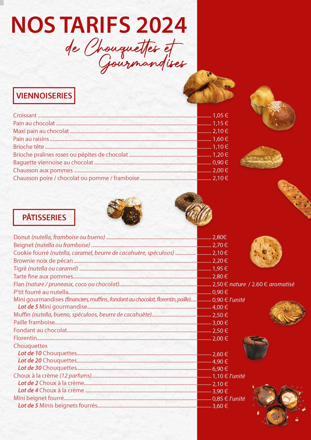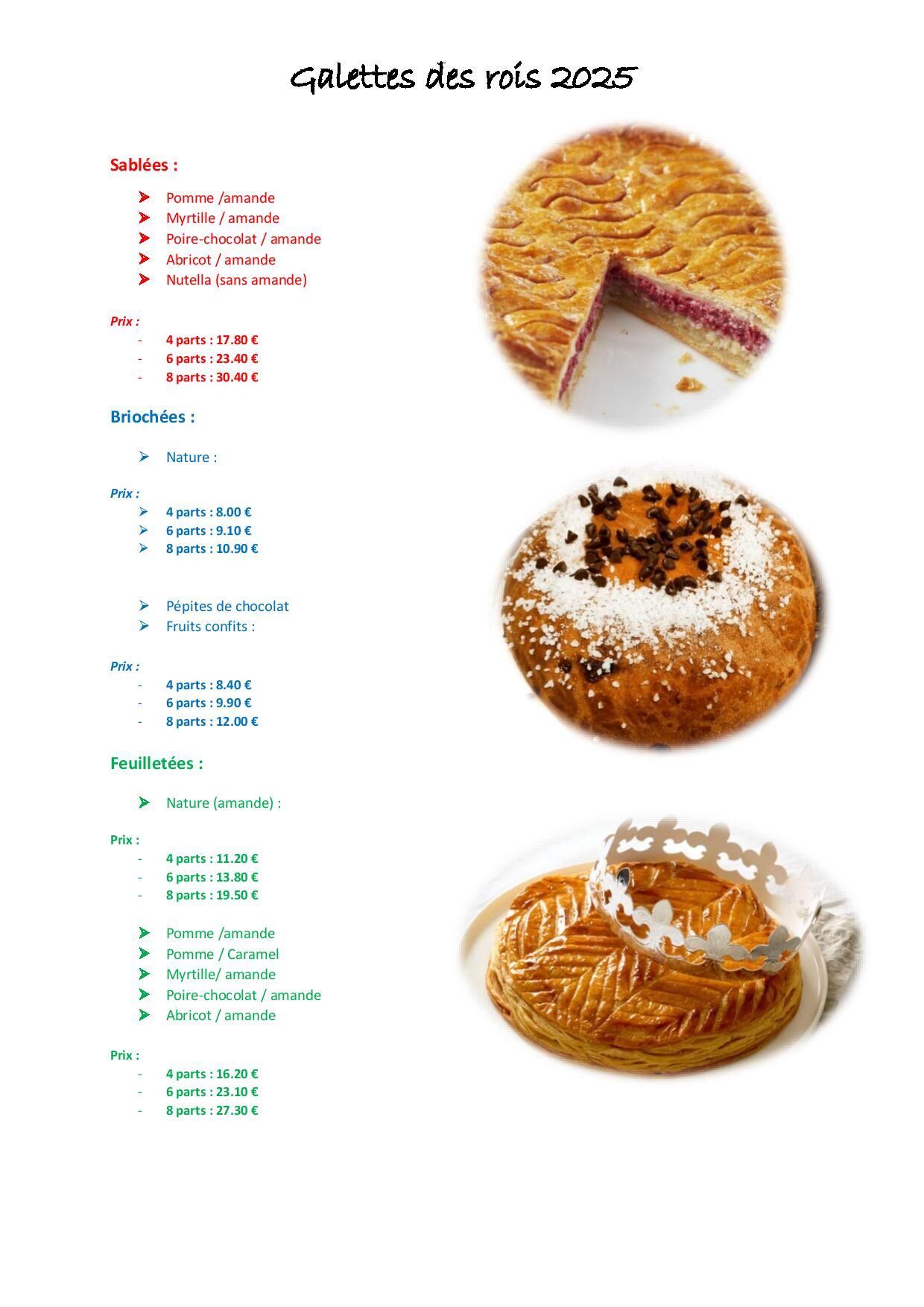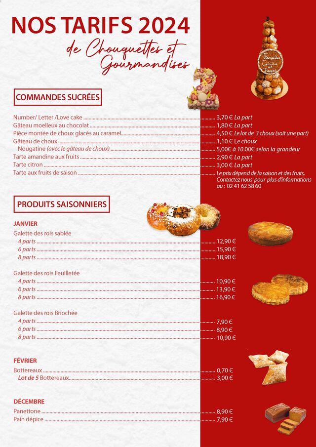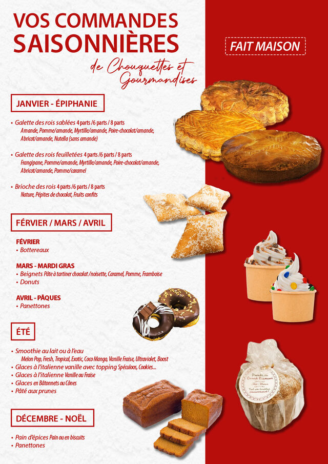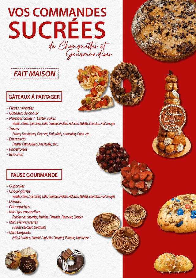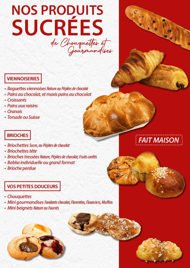 Côté sucré, nous proposons : viennoiseries, petits gâteaux secs, entremets, tartes, pièces montées, number et letter cakes, gâteaux de choux, pâtisseries, galettes frangipanes, brioches, bottereaux, Panettones ...
